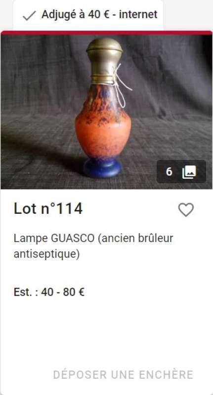 ico033 Étude de Maître Beghin à Pont Audemer (27), cette Lampe à catalyse Guasco a été adjugée au marteau le 2 mai 2022 au prix de 40,00 €