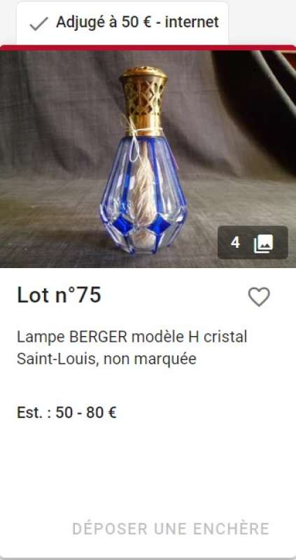 ico033 Ebay Cette Lampe Berger Paris en cristal de Saint Louis avec filets et petits losanges bleus a été adjugée le 8 juin 2022 au prix de 126,00 €