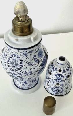 ico033 Ebay, cette Lampe Berger Paris Saupoudreuse décor Delft de Paul Bocquillon dont la monture à beaucoup souffert a été vendue en achat immédiat le 25 novembre 2025 au prix de 89,95 €