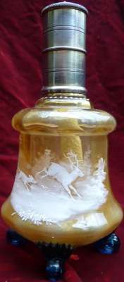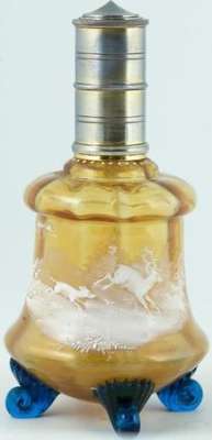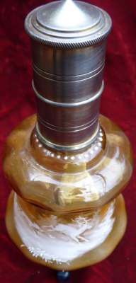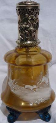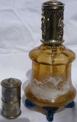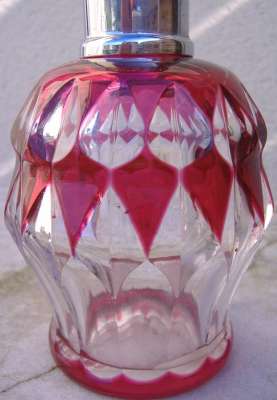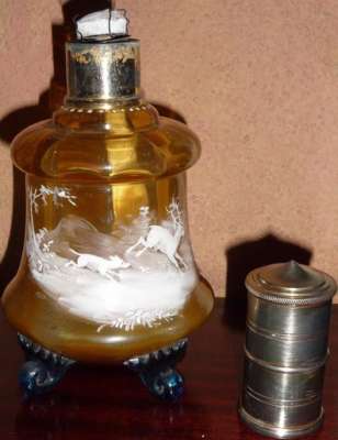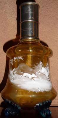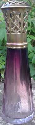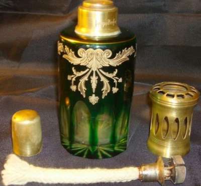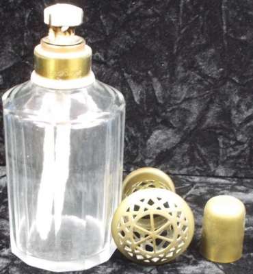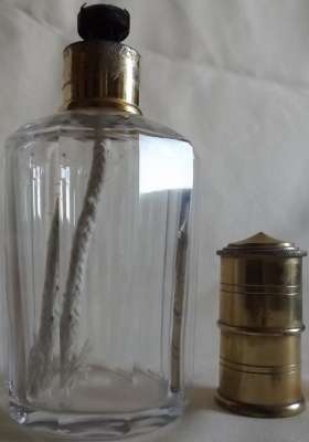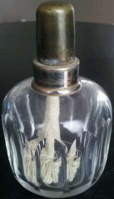 Lors d'un bref passage sur Paris, j'ai pu voir sur une brocante ce me^me flacon monté en vaporisateur à parfum. Très probablement sa fonction originelle.