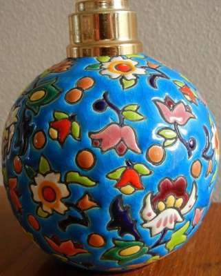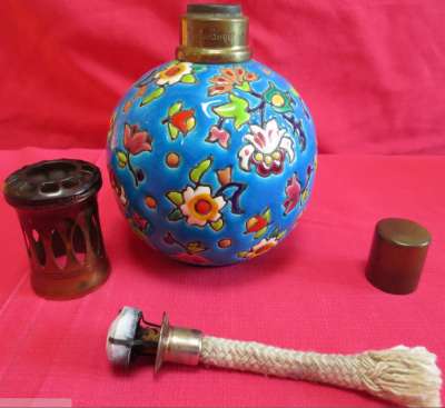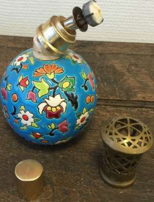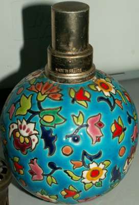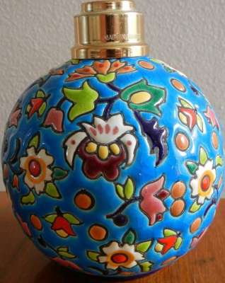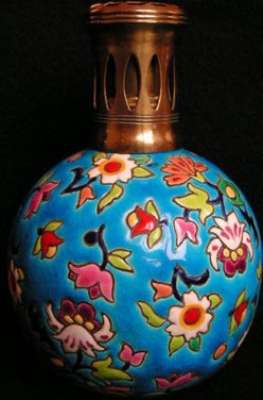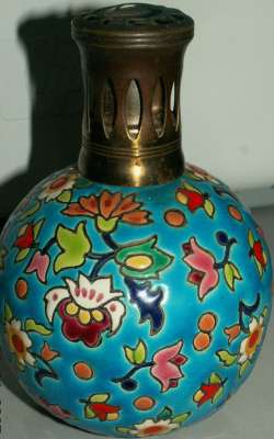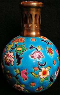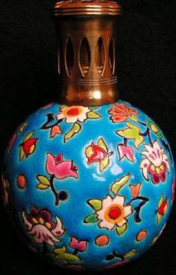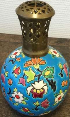 ico033 Ebay  Cette Lampe Berger Paris faite en émaux de Longwy fleurs multicolores sur fond bleu a été adjugée le 19 Février 2015 au prix de 96 €