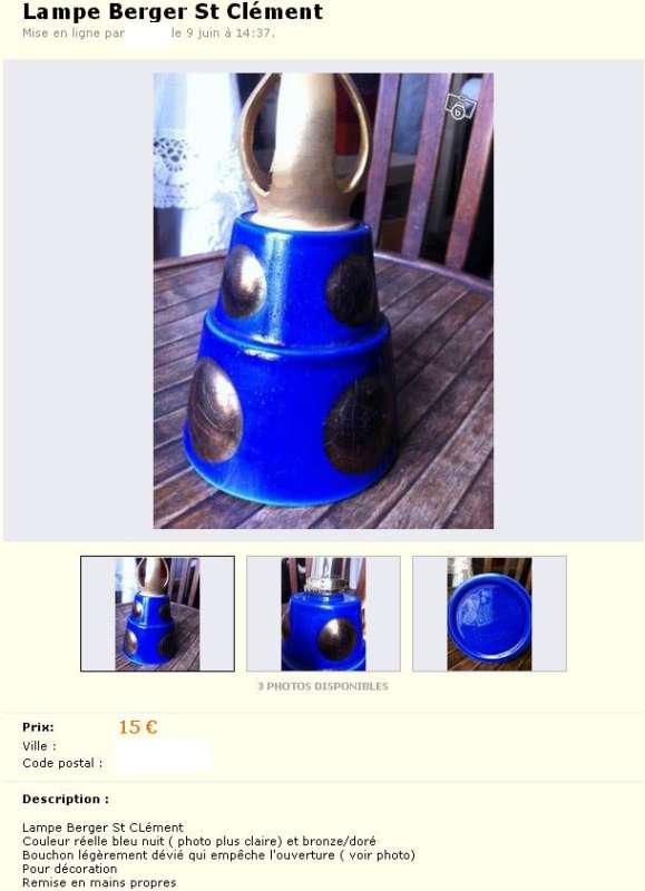 ico033 Leboncoin Cette Lampe Berger Saint Clément 5172 ZB par Pierre Casenove a été vendue courant juin 2013 au prix de 15,00 €