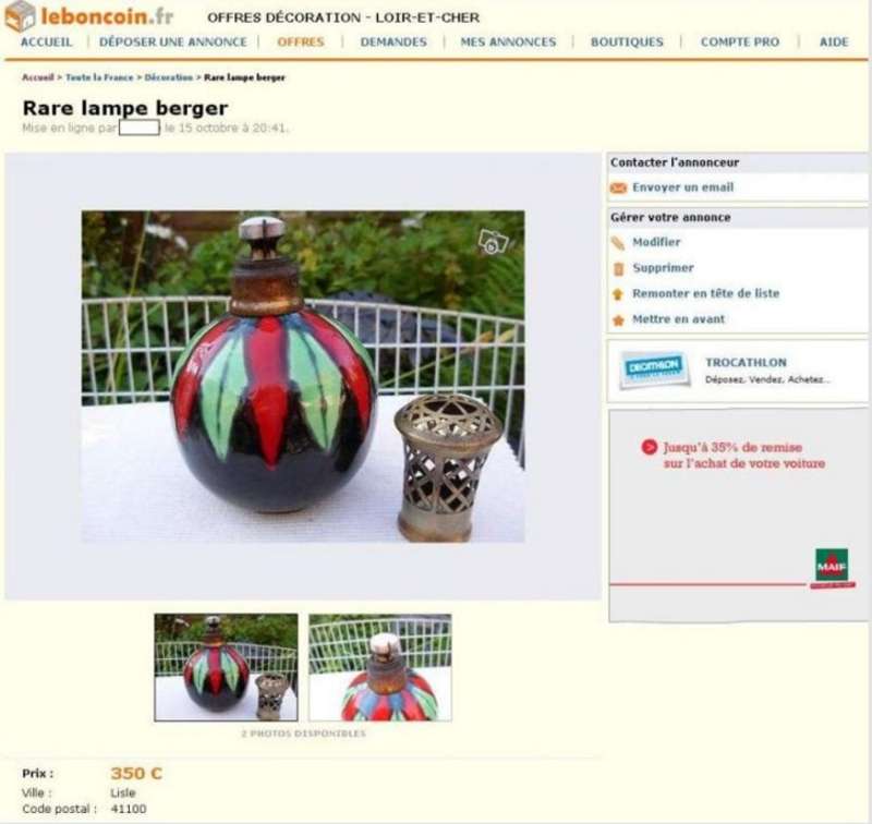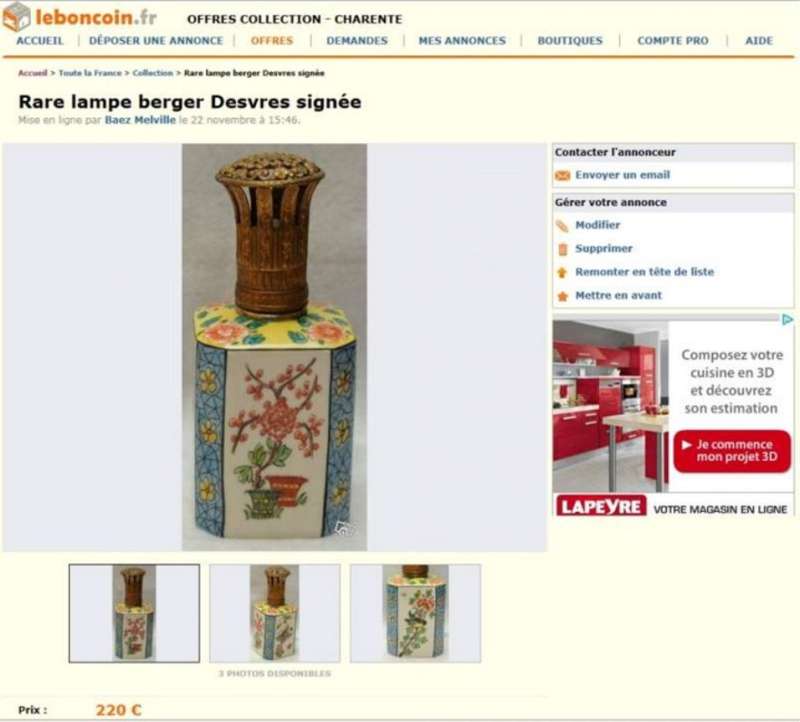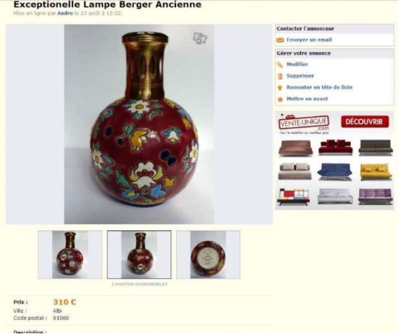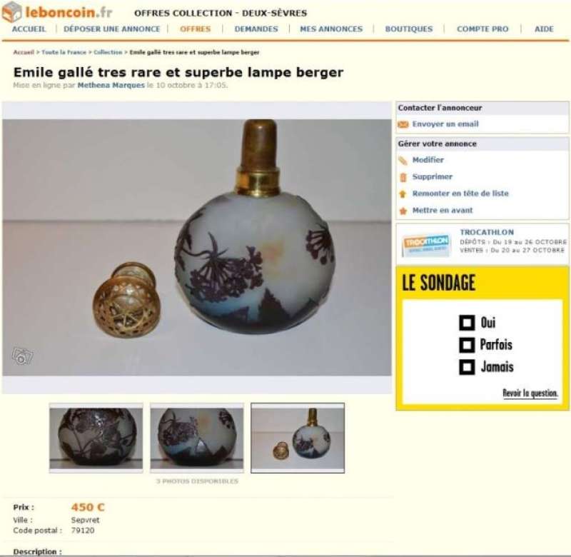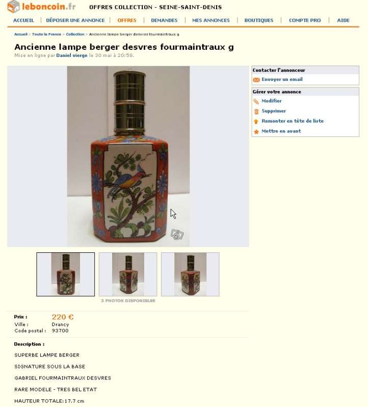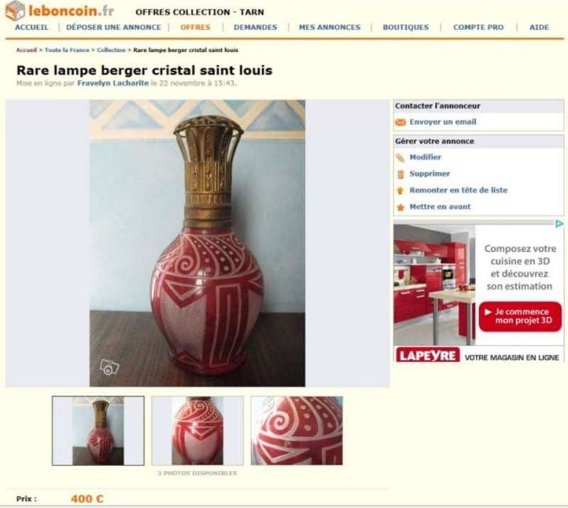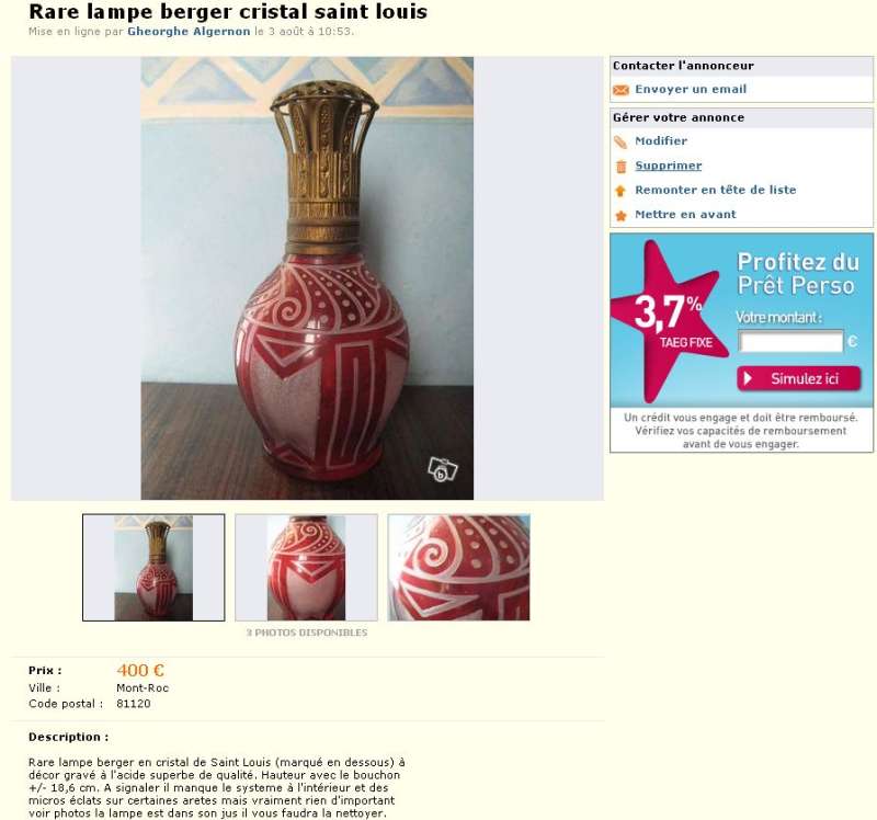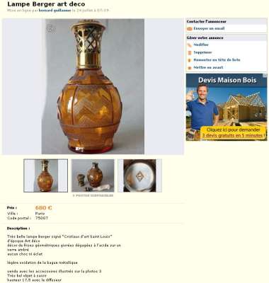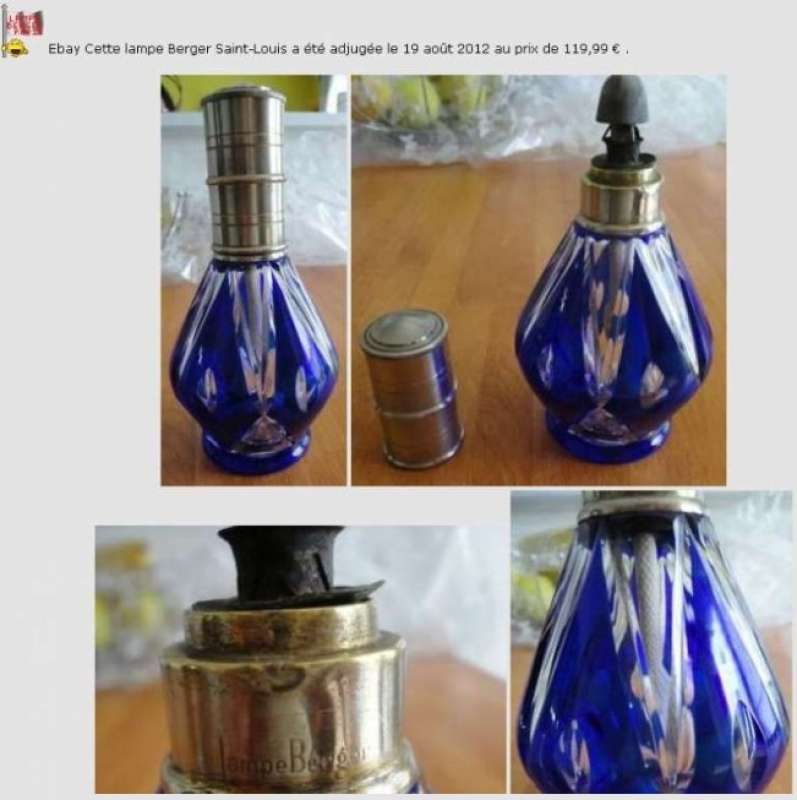 La lampe Berger Longwy grenat adjugée sur Ebay le 27 mars 2012 à 656 € (voir ici : http://www.bergermania.fr/index.php?topic=34.120 ) se retrouve sur leboncoin aujourd'hui (avec les mêmes photos que sur Ebay  ico047 ) au prix de 310 € : http://www.leboncoin.fr/decoration/357555800.htm?ca=22_s  ... et ce n'est malheureusement pas une première pour cette lampe !  ico042