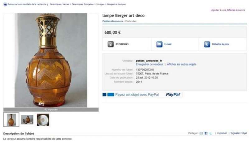 La lampe Berger Saint-Louis vendue le 10 juillet 2012 au prix de 935 € aux enchères sur Ebay (voir ici : http://www.bergermania.fr/index.php?topic=1528.0 ) se retrouve ce soir sur les petites annonces d'Ebay au prix de 680 € : http://cgi.ebay.fr/lampe-Berger-art-deco-/130736207218 : Bizarre, bizarre ...  ico043 D'autant plus quand on regarde les autres objets du "vendeur" qui n'a jamais les mêmes coordonnées ...  ico044 ico044