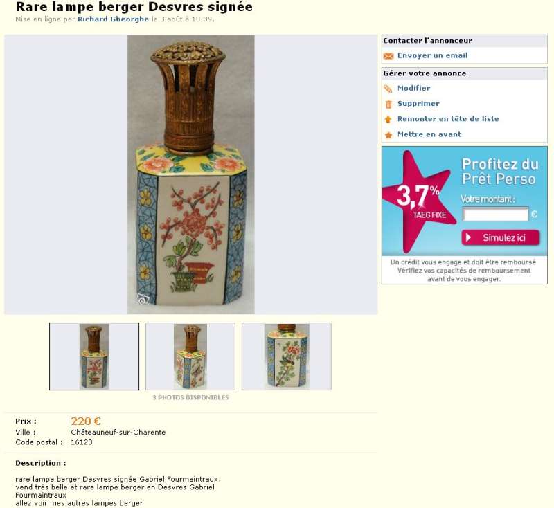 Plusieurs fois j'ai signalé ce pseudo vendeur de lampes Desvres au site et à chaque fois ils retirent les annonces, mais régulièrement il revient à la charge, encore en ce moment.
